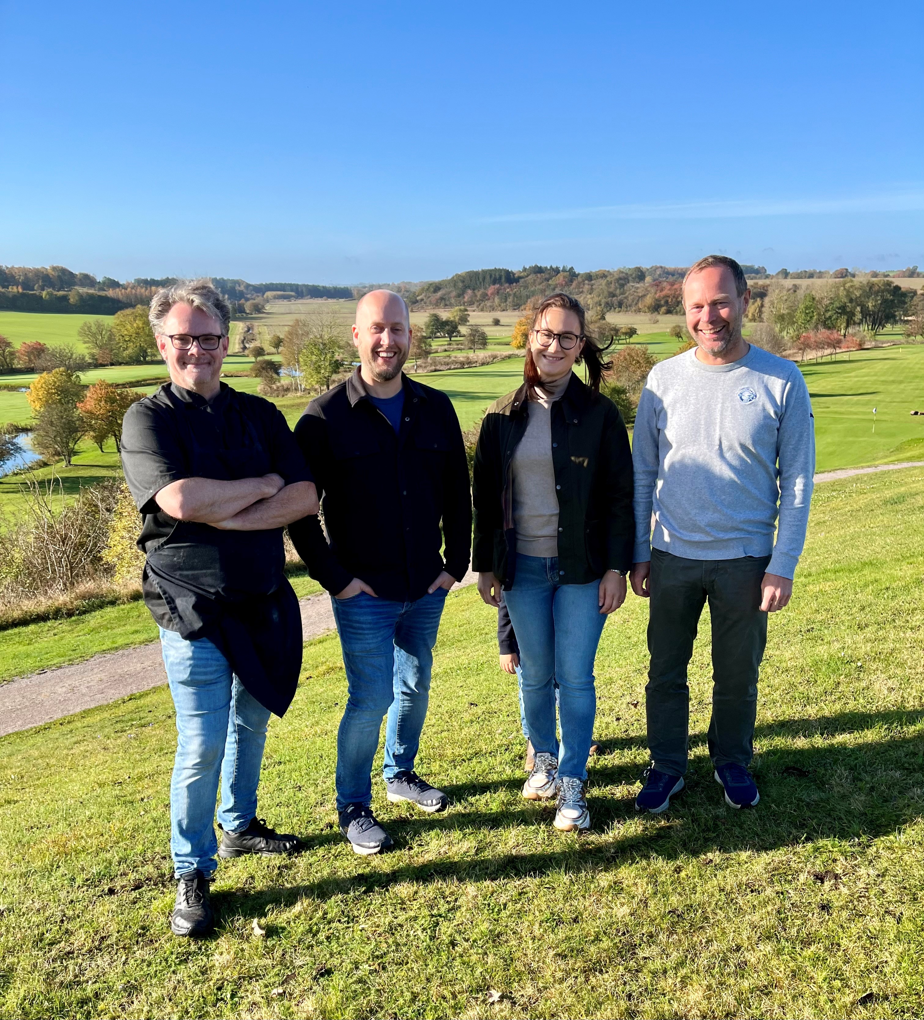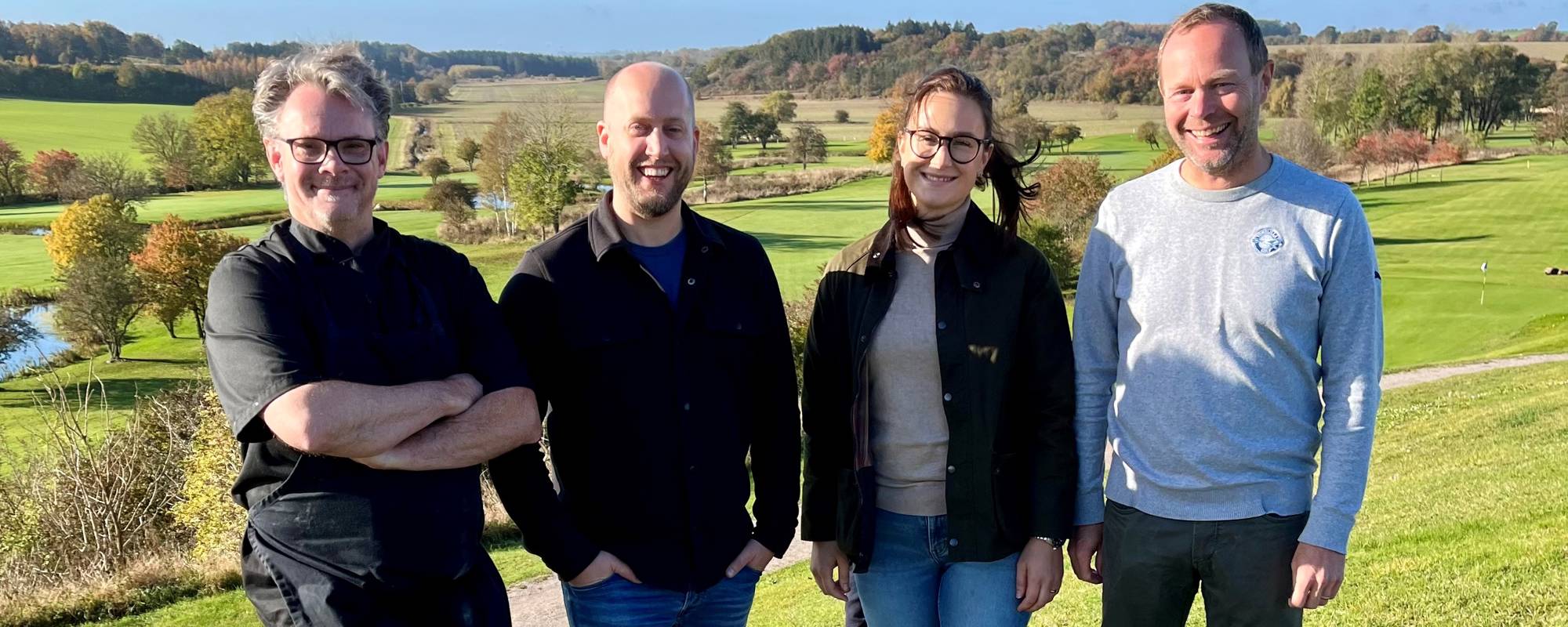 Bildtext: Henrik Larsson och Gustav Jönsson (H&G:s kök) lämnar över restaurangverksamheten på Tomelilla Golf till Madeleine Ferrius (Mål 19). Klubbchef Kristian Hägglund till höger.