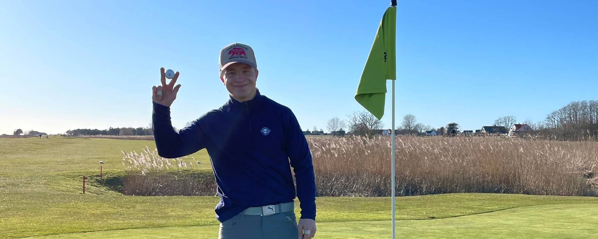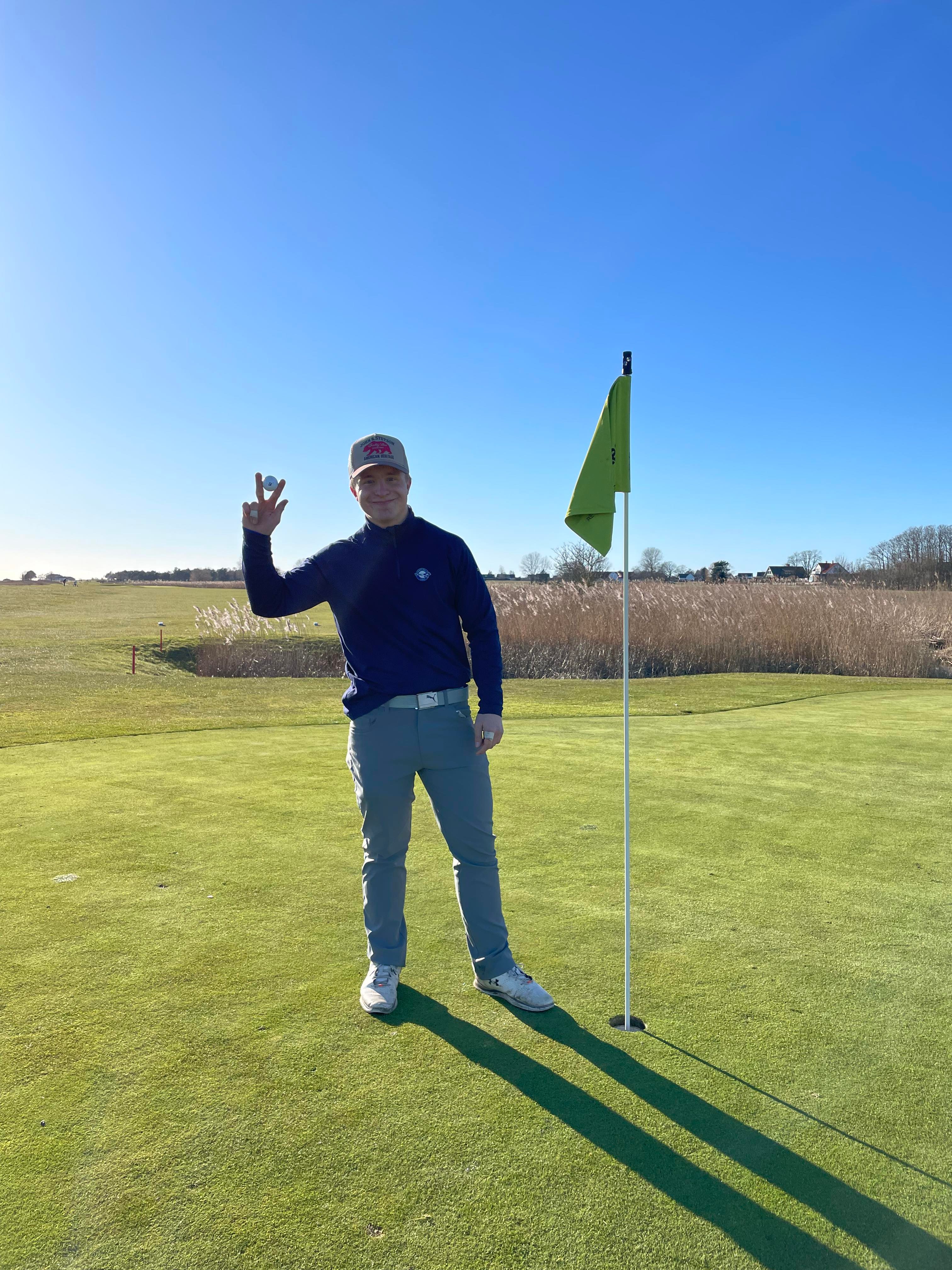 - Jag fick meterna från min medspelare Dylan Nilsson. Det var 102 meter till flaggan, med lite vind från höger. Jag tog en lugn pitch och siktade lite höger om flaggan. Jag slog slaget och blev av med bollen i solen. Det var på eftermiddagen så solen stod lågt. Då säger Dylan att bollen var höger om flaggan. Jag tänkte att den iallafall borde vara säker på greenen, men jag såg fortfarande inte bollen. När jag plockade upp peggen och satte klubban i baggen skriker Dylan av glädje att den gick i. Sedan gick vi fram och såg att den låg där i hålet, berättar Måns Högström.