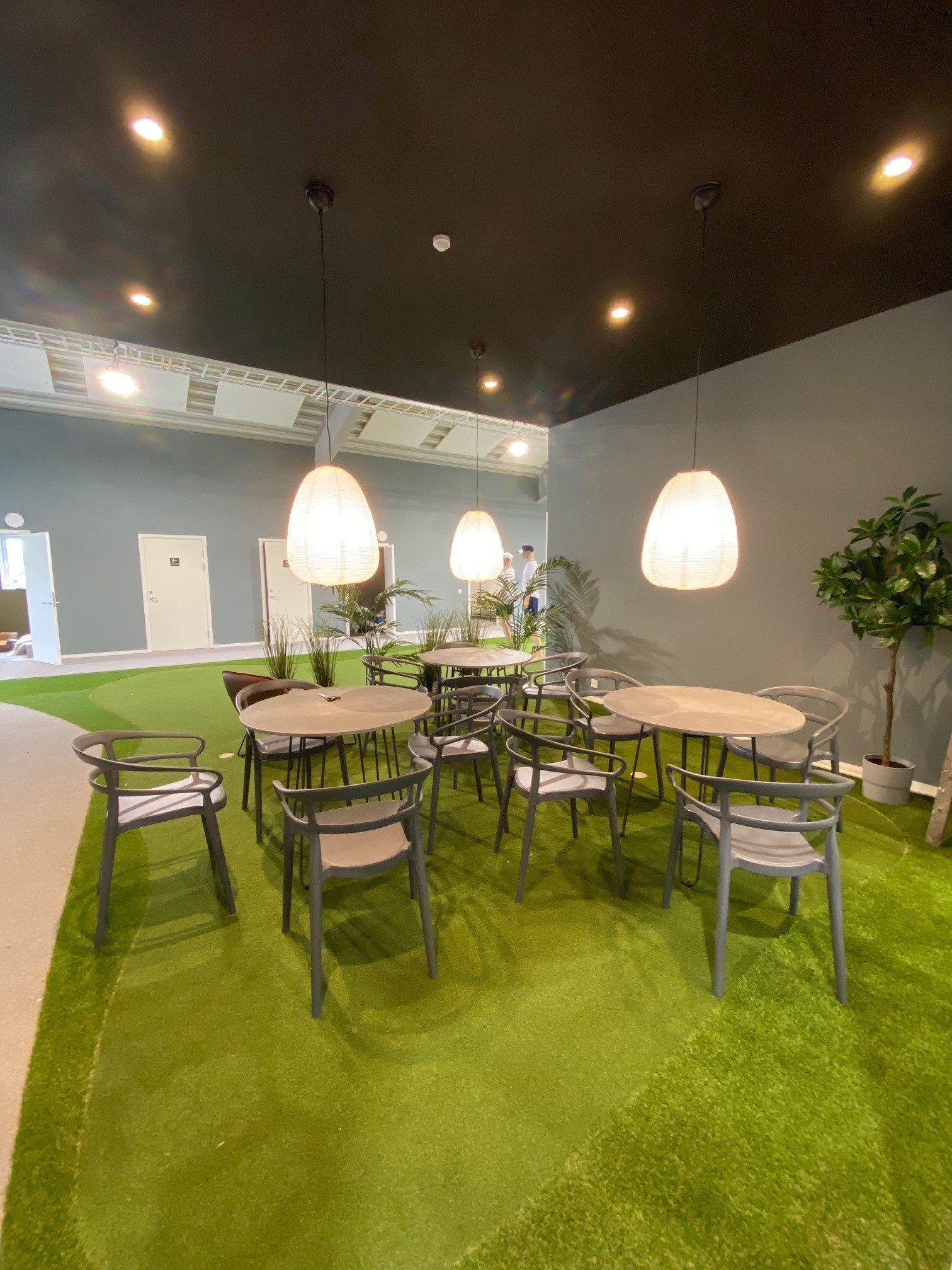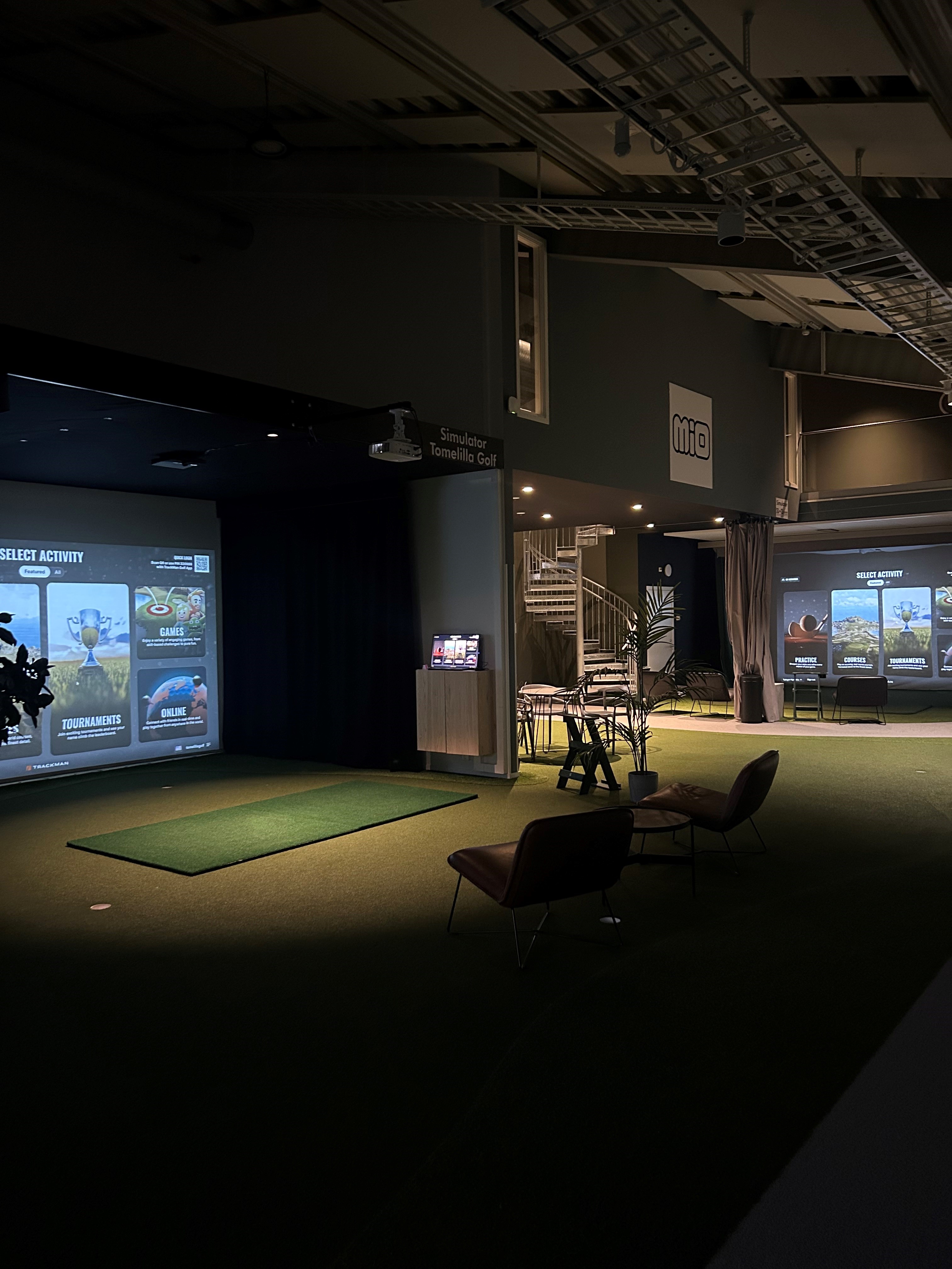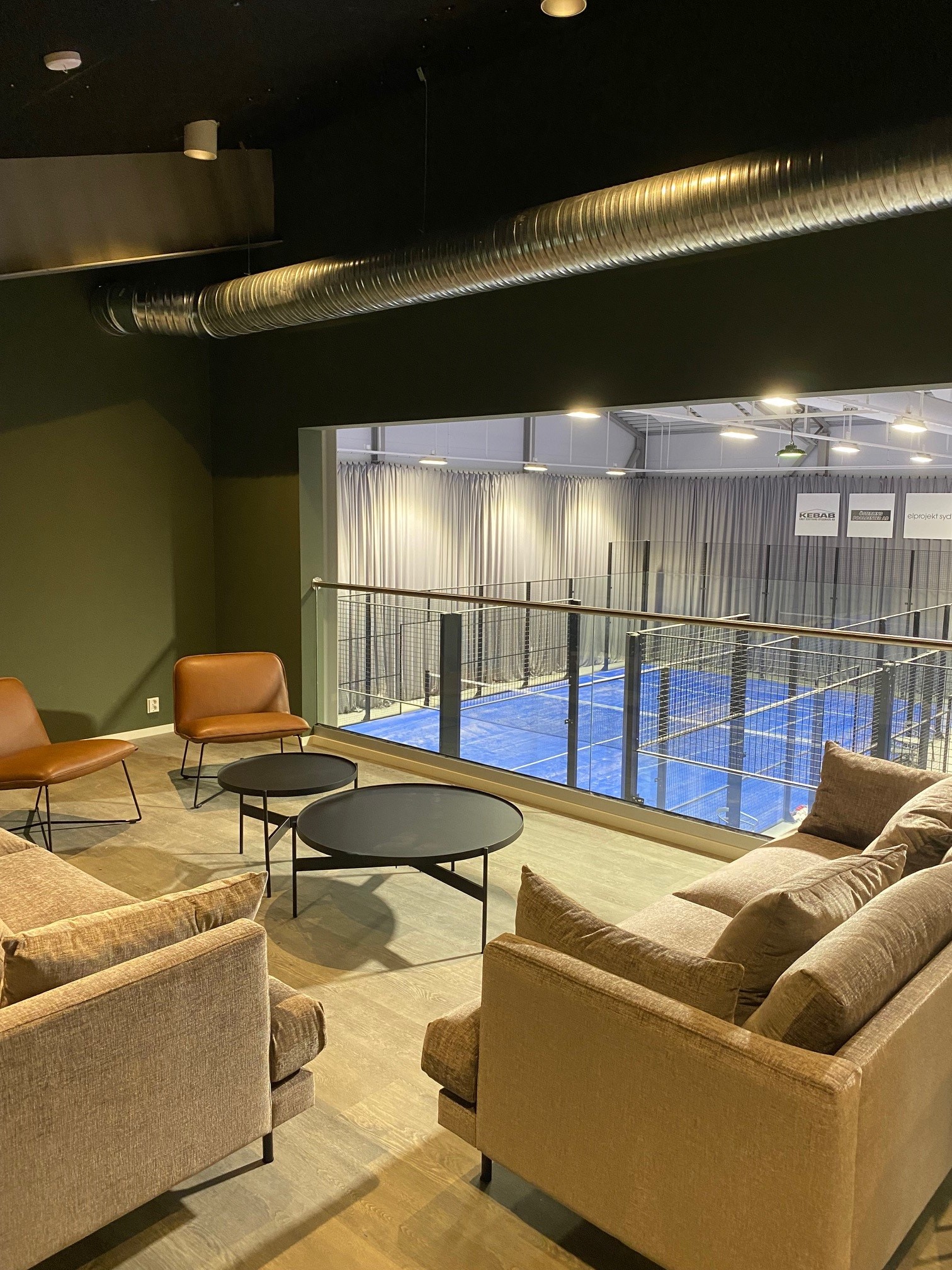 Förutom detta finns lounger och balkonger med utsikt över både golf- och padelhallen. I hallen finns även en minikiosk med snacks och dricka till självbetjäning. Restaurangen erbjuder enklare mat och mackor mot förbeställning. Till sist - här inne i hallen är det alltid vindstilla och runt 20 plusgrader.